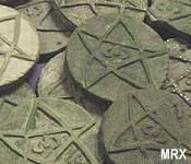 After the mold was made, I used portland cement, sometimes colored with a little black grout mix, to cast my Elder Sign. Then I would paint it with a black wash (acrylic paint thinned with water) to deepen the color, and then a wash of bright green to give it a nice moldy patina.